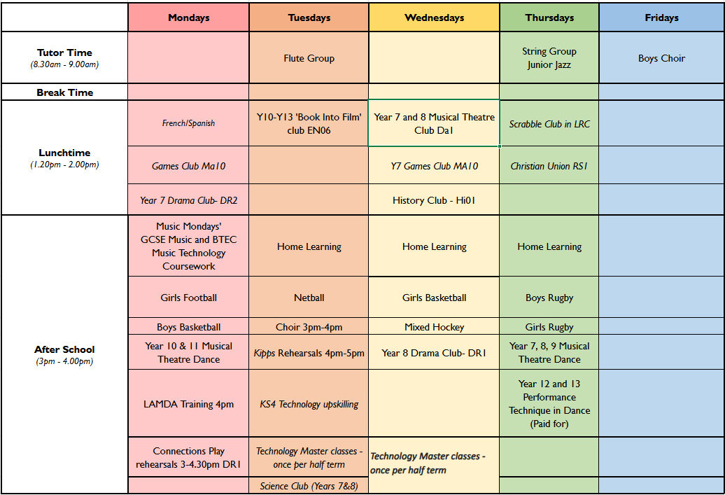 Please have a look at the timetable below and discuss with your child which clubs they may wish to try.